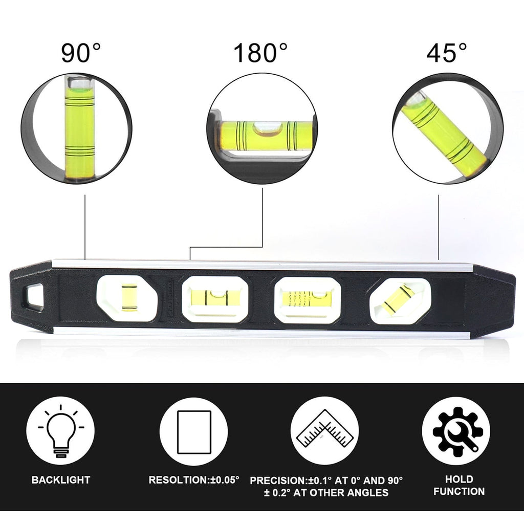 • 3 precision bubble vials for horizontal, vertical, and 45° angle measurements.